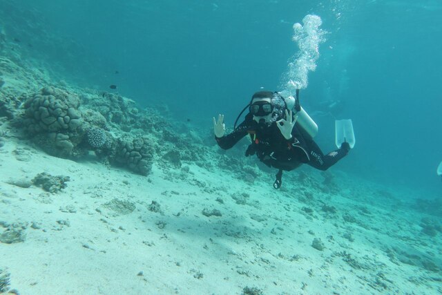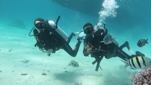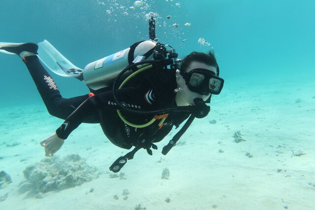 Du lernst die Basics des Tauchens, Theorie und Praxis, Technik (Anschließen der Sauerstoffflasche an die Tarierweste, Überprüfen der Funktionen) über Atmen und Schweben im Wasser sowie das Kommunizieren mit deinem Tauchbuddy.